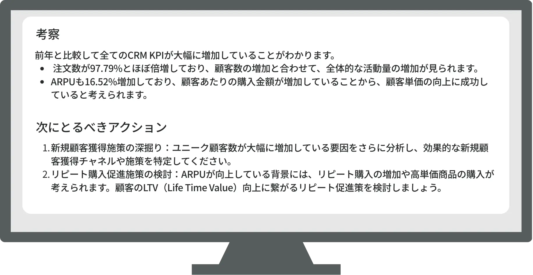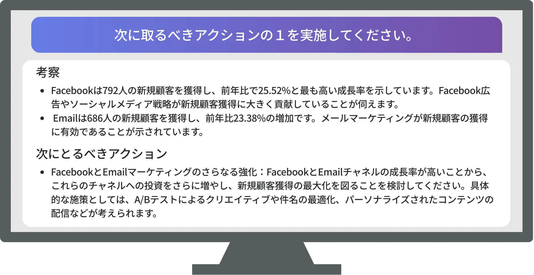 考察や次に取るべきアクションも詳細に提示します。